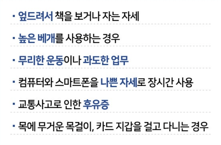 사고 : 교통사고나 스포츠 사고와 같은 외적 요인도 목디스크의 원인이 될 수 있습니다. 이런 사고로 인해 목에 직접적인 충격이 가해지면 디스크에 손상이 생길 가능성이 높습니다.