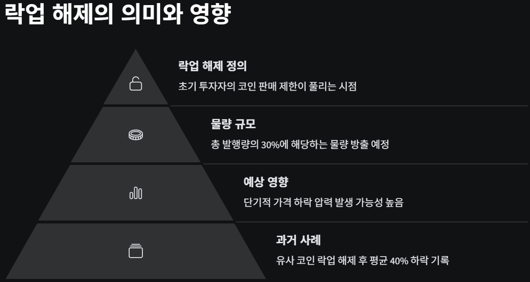 락업(lock-up)이란 개발자, 초기 투자자들이 보유한 코인을 일정 기간 동안 시장에 유통하지 않도록 묶어두는 방식이다. 이 락업이 풀리는 시점에는 대량의 물량이 시장에 등장할 수 있고, 공급 충격으로 인한 가격 하락이 우려되기도 한다. 하지만 반대로, 시장이 해당 물량을 모두 흡수하고도 가격을 유지하거나 오히려 상승한다면, 강력한 상승세로 이어질 가능성도 있다.
