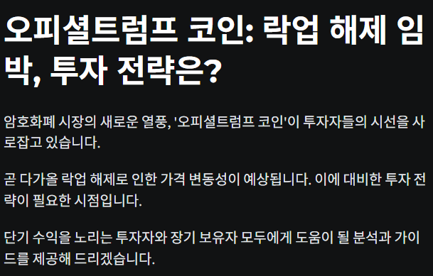 오피셜트럼프 코인의 락업 해제는 상승과 하락의 갈림길이 될 수 있다. 단기적으로 급등세가 나타날 수 있지만, 그만큼 빠른 하락도 따라올 수 있다는 점을 명심해야 한다. 밈코인의 본질은 펀더멘털보다 분위기와 커뮤니티 흐름에 의존한다는 점에서, 지금은 이성적인 판단과 철저한 계획이 필요한 시점이다.