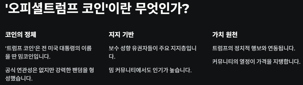 이 코인의 가장 큰 특성은 ‘정치성’과 ‘밈 문화’의 결합이다. 도널드 트럼프라는 인물의 정치 행보에 따라 시세가 출렁이는 구조이며, 미국 대선 국면이 가까워질수록 커뮤니티 기반 수요도 늘어나는 추세다. 이 코인의 가격에 영향을 주는 이례적인 구조 덕분에, 투자자들은 일반적인 기술 분석 외에도 뉴스 흐름을 면밀히 따라야 한다.